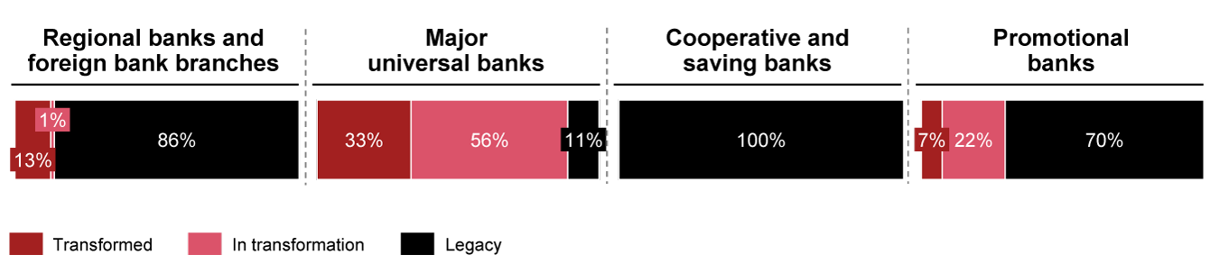 In the banking sector, major private banks are leading the transition. Approximately 56% of these institutions are either fully transformed or actively modernizing, driven by the need to decouple retail operations from global investment banking architectures and compete with agile market entrants. By contrast, the cooperative and savings bank sectors show a different trajectory, with 100% relying on established legacy platforms. For these institutions, centralized mainframes (such as OSPlus or agree21) continue to process high transaction volumes at low unit costs, often making the business case for a full cloud-native replacement challenging in the absence of a compelling catalyst.