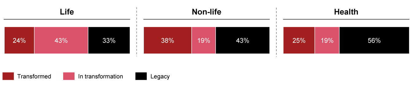 In the insurance sector, structural divergence is driven by product complexity. Non-life is leading the way, with 38% transformed insurers and 19% in transformation, forced into API-enabled ecosystem connectivity by pricing aggregators and annual policy renewals. On the other hand, 43% of life carriers have initiated modernization but lag significantly behind in transformation completion (24%), as they operate with long-term product horizons. They must replicate decades of different and complex financial guarantees under strict regulation, meaning that historical margins and solvency requirements encourage them to incrementally patch legacy mainframes and to delay complex migrations. Lastly, deeply localized German requirements like statutory aging reserves anchor 58% of health insurance players into legacy.