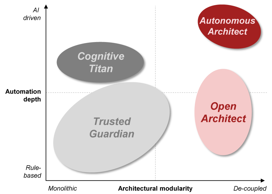 As the market matures, the era of the generic "core banking system" has ended. Vendors are no longer competing solely on product feature lists but are aligning themselves with specific strategic archetypes that mirror the evaluation in the industry along the dimensions of “automation depth” and “architectural modularity”. Hence, core system suites fall into four distinct archetypes, as shown in the following exhibit: