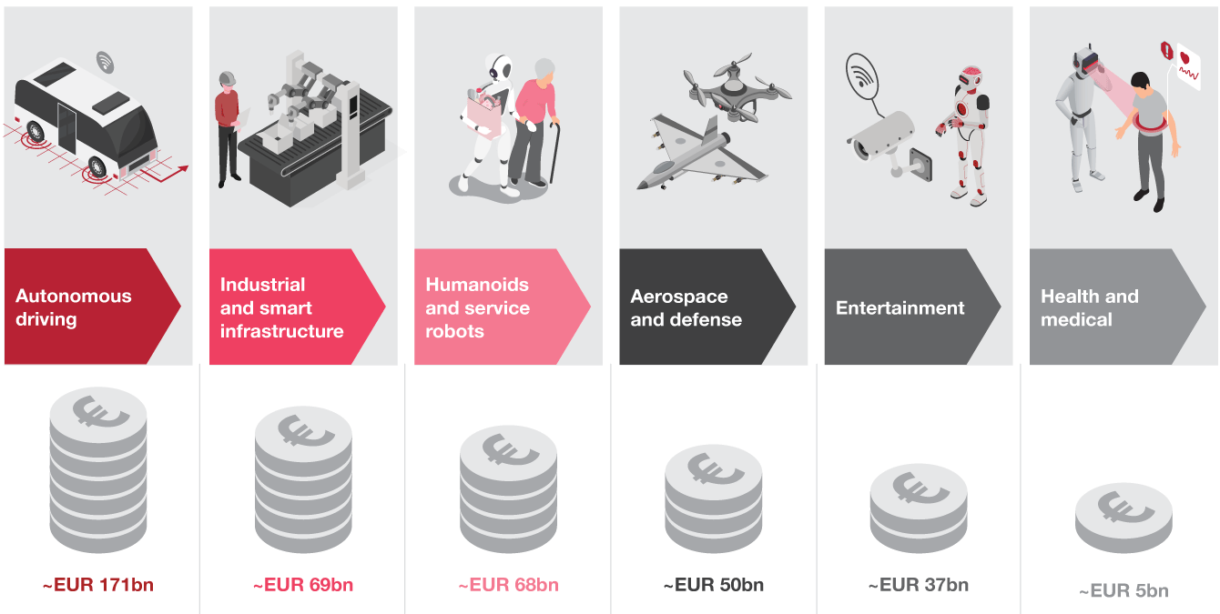 What has changed is practical feasibility. Converging technologies have moved Physical AI from research ambition to commercial experimentation. Early deployments already exist across logistics, manufacturing, mobility, healthcare, and defense, with a combined Physical AI market potential of approximately €430 billion by 2030. The critical question is how companies position themselves within this emerging ecosystem to capture value across the full technology stack.
