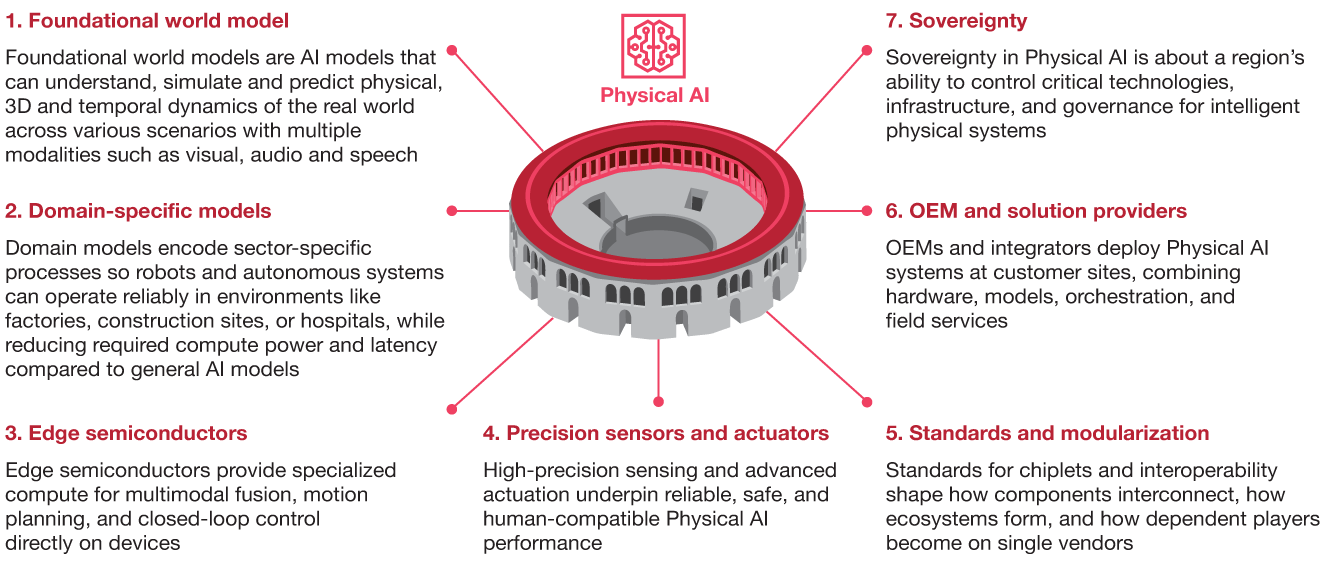 Building on these value pools, the Physical AI era is taking shape around seven key arenas that govern how intelligent machines are built, deployed, and controlled. Each arena presents distinct value creation strategies, control points, and risks for both global leaders and European companies seeking to balance competitiveness with strategic independence.
